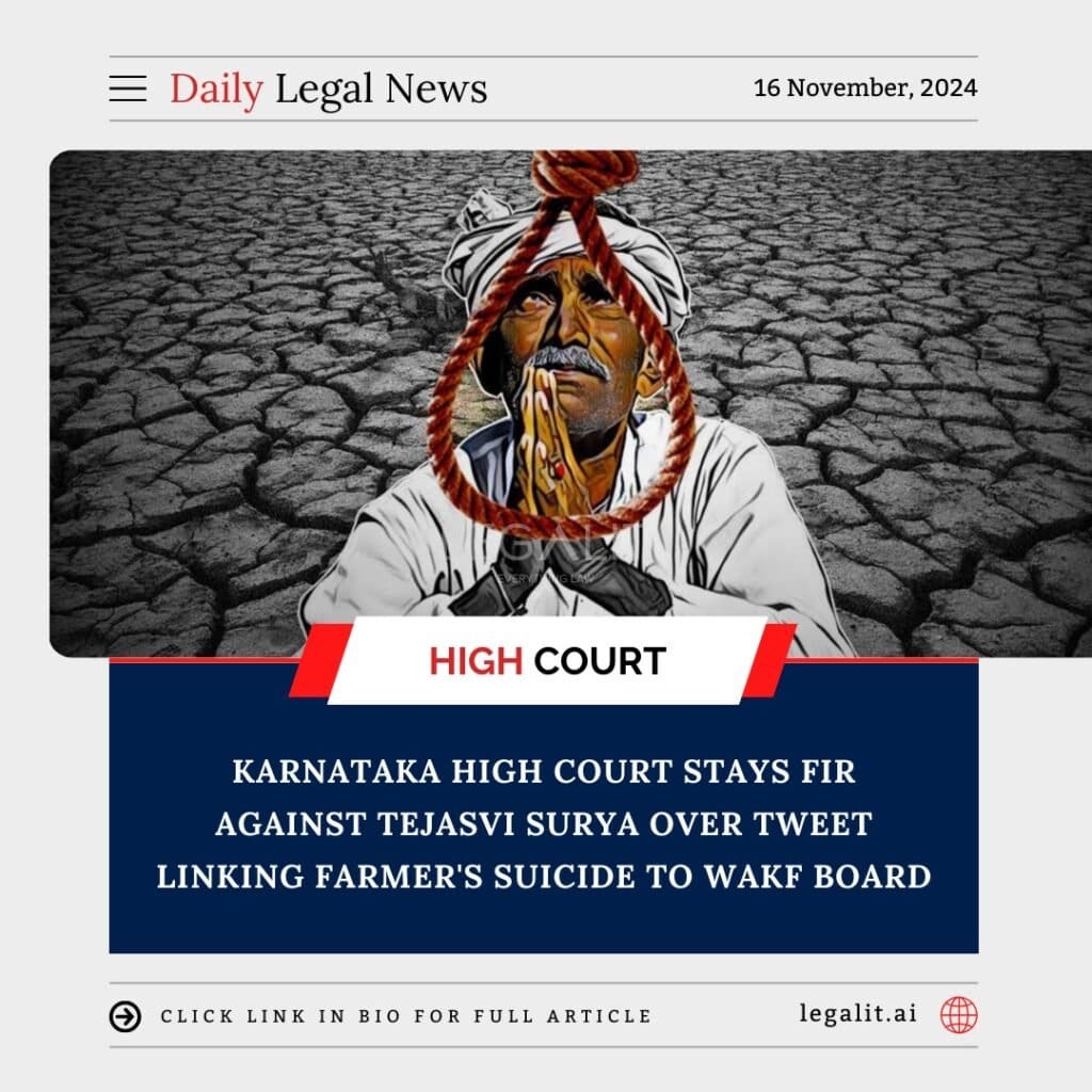 The Karnataka High Court has stayed the First Information Report (FIR) filed against Tejasvi Surya, Member of Parliament from the BJP, in connection with a tweet where he allegedly linked a farmer’s suicide to the Wakf Board. The case had sparked significant controversy, with Surya accused of spreading misinformation and defaming the Wakf Board, a government body managing religious endowments, by attributing the farmer’s suicide to them without any substantial evidence.
