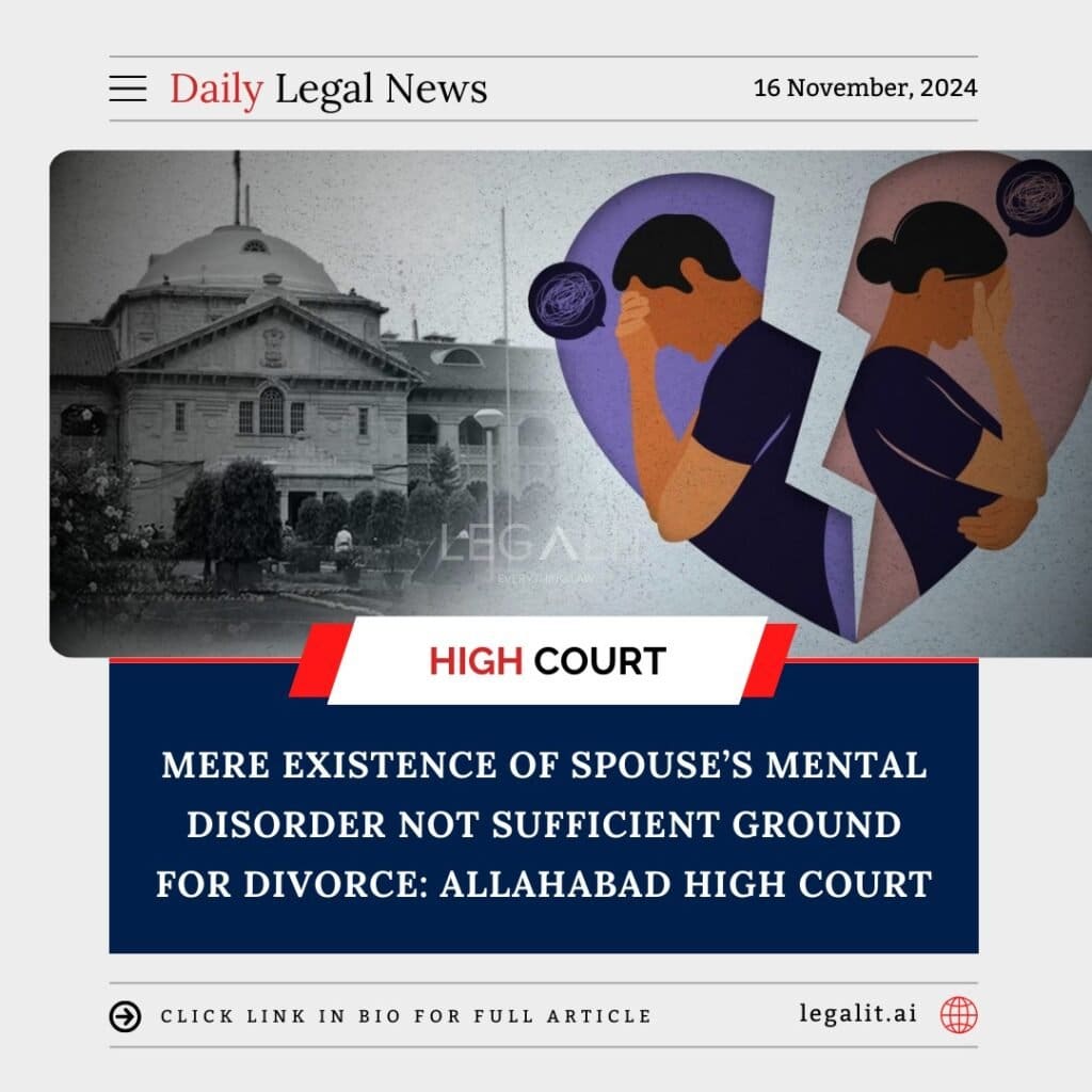 The Allahabad High Court has ruled that the existence of a mental disorder in a spouse does not automatically justify the grant of divorce, emphasizing that the condition must make it impossible for the other spouse to live with the afflicted partner.